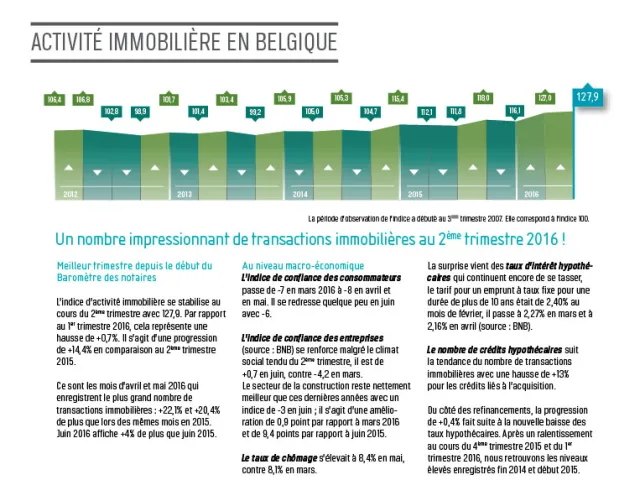 Au 2ème trimestre 2016, l’indice d’activité immobilière s’élevait à 127,9 – un nouveau record depuis le lancement du Baromètre des notaires. Par rapport au 1er trimestre 2016, il s’agit d’une hausse de +0,7%. En comparaison avec le 2ème trimestre 2015, on note une augmentation de +14,4%.