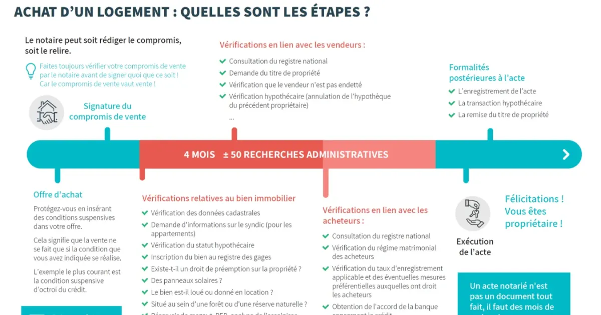 Votre parcours immobilier en un coup d'œil ! Vous envisagez d'acheter une maison ou un appartement, mais vous ne savez pas par où commencer ? Pour vous aider à y voir plus clair, Notaire.be a créé une infofiche détaillée qui vous guide à travers toutes les étapes du processus d'achat. Offre, compromis de vente, recherches administratives et fiscales, signature de l'acte notarié : le parcours immobilier n'aura plus de surprise pour vous !