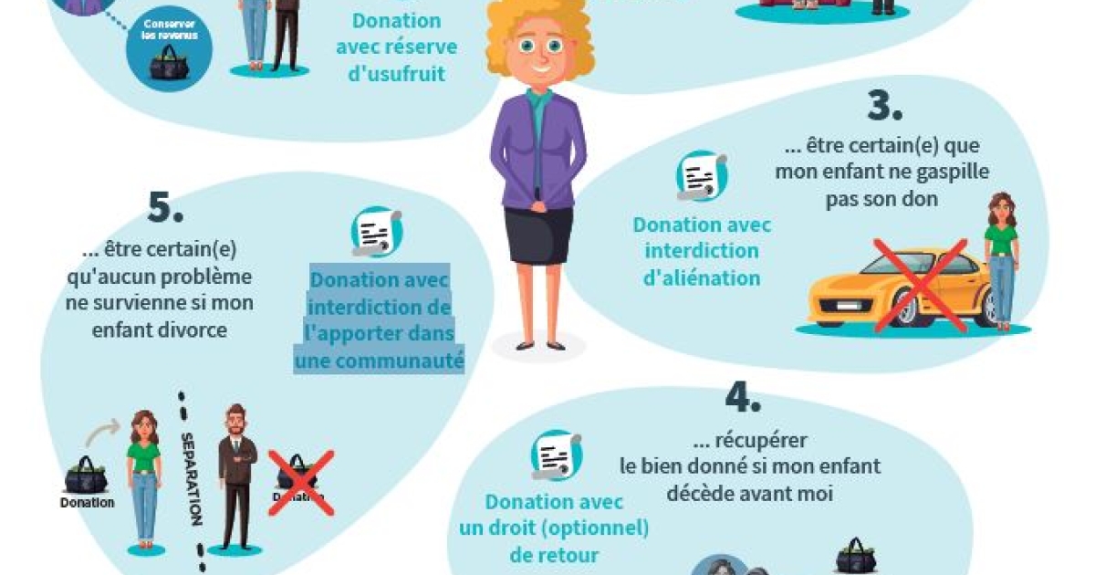Donné, c'est donné. C'est vrai ! Mais il est toujours possible de prévoir certaines choses pour éviter les mauvaises surprises. Vous voulez par exemple faire une donation de votre appartement à votre enfant, mais vous craignez qu'en cas de divorce son conjoint ait droit à la moitié de l'appartement. Ne vous inquiétez pas, vous pouvez prévoir une donation avec interdiction de l'apporter dans une communauté.