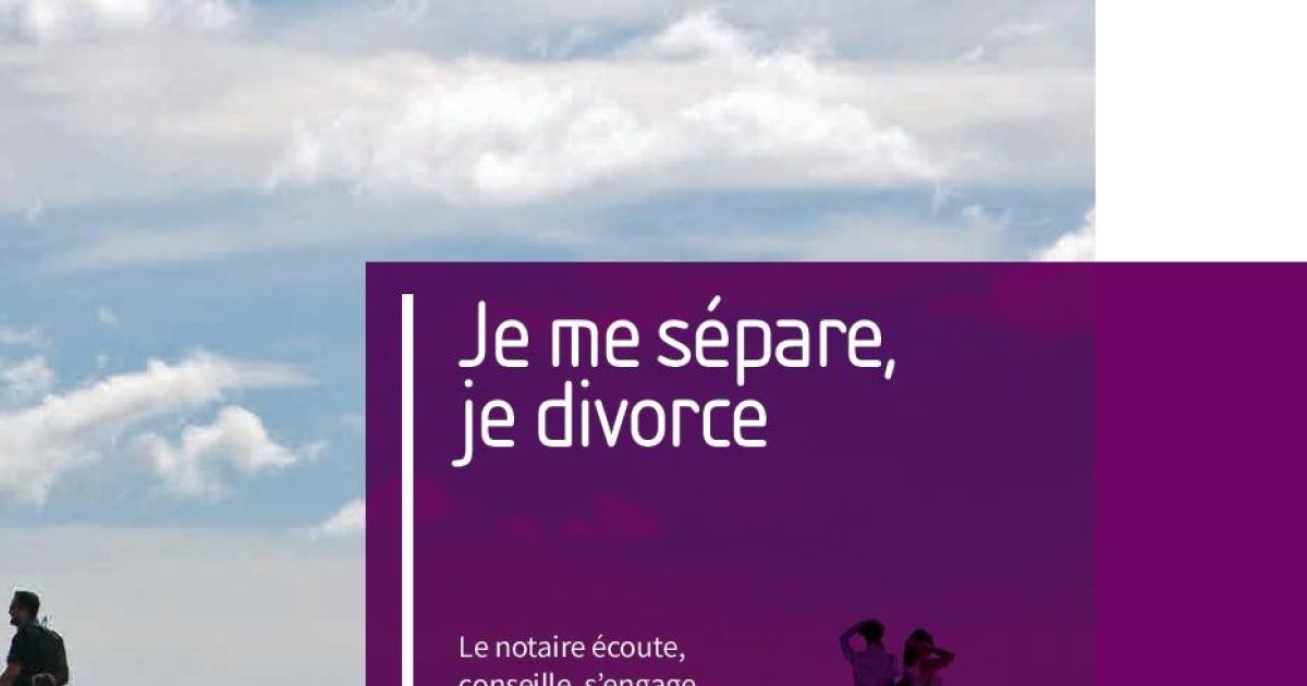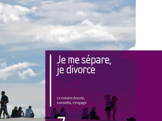 Notre brochure a pour but de vous informer sur tous les aspects de votre séparation ou de votre divorce : divorce par consentement mutuel, divorce pour désunion irrémédiable, séparation de fait, décisions relatives aux enfants... Dans tous les cas, informez-vous sur les conséquences de votre séparation. Le notaire vous expliquera les procédures existantes et vous conseillera afin que cette étape se déroule le plus sereinement possible. Son rôle sera d’autant plus actif dans le cadre d’un divorce par consentement mutuel. Dans certains cas, le passage chez le notaire est même obligatoire : lorsque vous devez vous mettre d’accord sur le partage d’un immeuble ou lorsque vous ne vous entendez pas sur le partage de vos biens et de vos dettes.