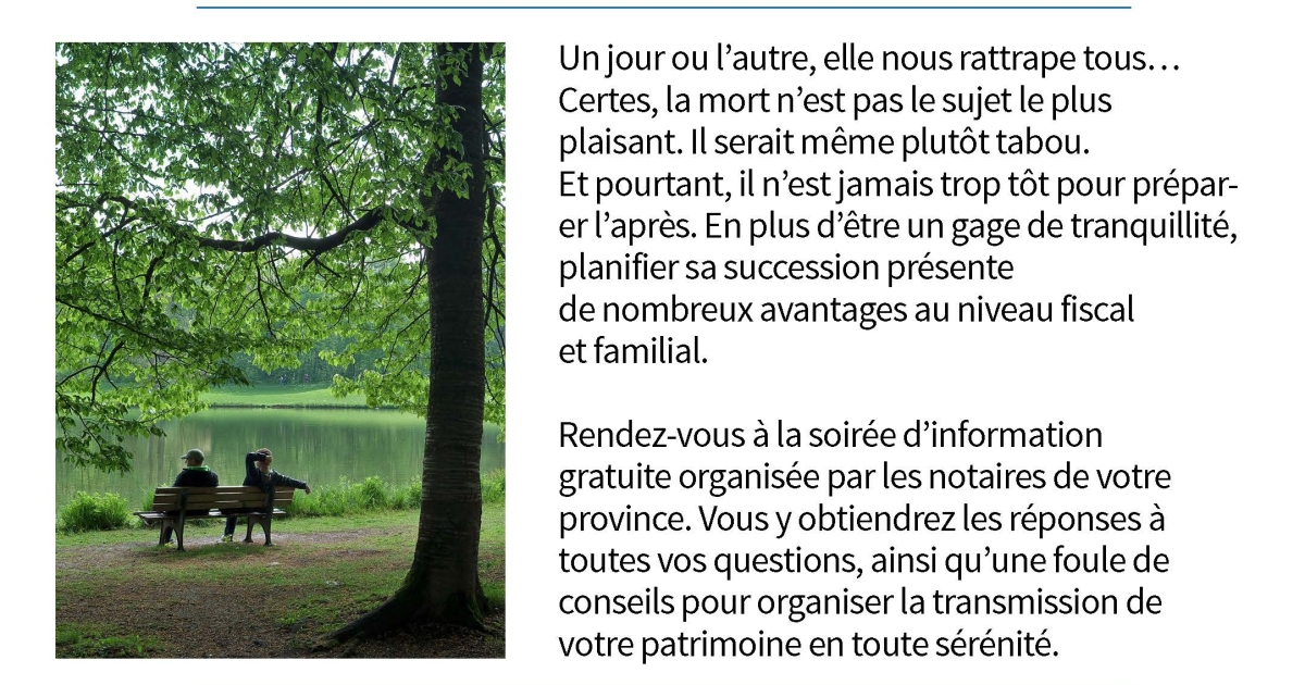 Rendez-vous à la soirée d’information gratuite organisée par les notaires de votre province. Inscription obligatoire via www.notaire.be/inscriptionssuccessions ou par téléphone.