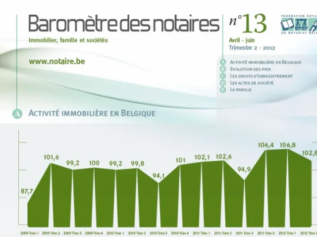 Au cours du 2ème trimestre 2012, le nombre de transactions immobilières reste élevé. Dans un contexte international difficile, le marché immobilier belge résiste, grâce à une situation macroéconomique stable et à un comportement des ménages raisonnable.