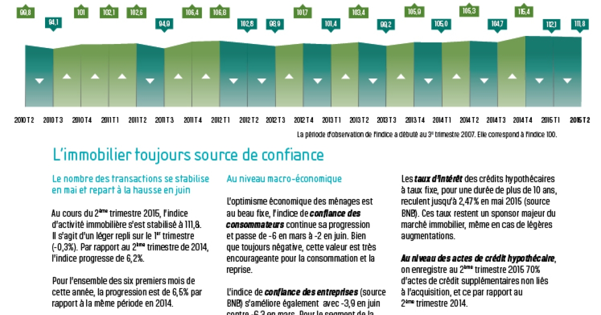 Au cours du 2ème trimestre 2015, le nombre des transactions immobilières a connu une évolution de +6,2% en comparaison avec le 2ème trimestre 2014. L’activité du marché immobilier a été particulièrement intense en juin (+18%).