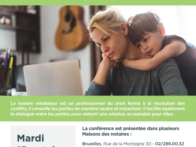 La conférence sera donnée dans plusieurs Maisons des notaires, par des notaires formés à la médiation La médiation est un processus alternatif de règlement d’un conflit par lequel un tiers neutre, un médiateur, entend les parties et les aide à trouver par elles-mêmes une solution acceptable à leur litige. Plus d’infos ici. :