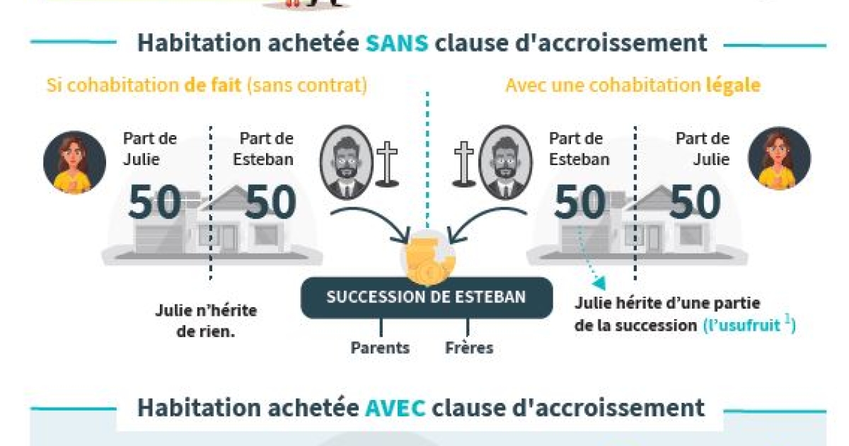 Vous n'êtes pas marié mais vous voulez que votre conjoint hérite de votre domicile à votre décès ? Pensez à la clause d'accroissement (infofiche)