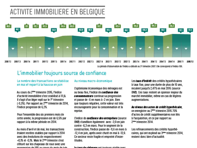 Le nombre des transactions immobilières a d’ailleurs augmenté dans les trois régions. L’activité en Flandre est 3,8% au-dessus de son niveau au 2ème trimestre 2014. En Wallonie, l’évolution est très nette avec +10,5%. En région Bruxelloise, les transactions progressent de 5,7%.