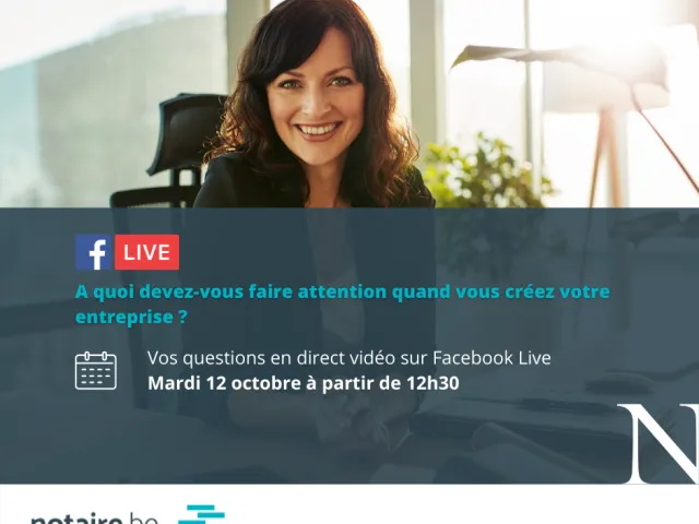 Notaire.be vous aide déjà avec de nombreux articles et infofiches dédiés à l’entreprenariat. Mais ce mardi 12 octobre, nous allons encore plus loin. Nous organisons un Facebook Live à 12h30. Un notaire namurois sera présent pour répondre, en direct, à toutes vos questions sur vos projets entrepreneuriaux.