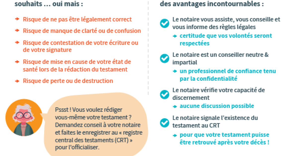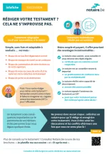 Pour planifier sa succession, pourquoi ne pas établir un testament et y inscrire toutes vos volontés ? Il existe deux types de testament : le testament écrit par vous-même à la main (testament olographe) et le testament établi par un notaire (testament notarié). Découvrez dans notre infofiche pourquoi il est conseillé de se rendre chez un notaire.